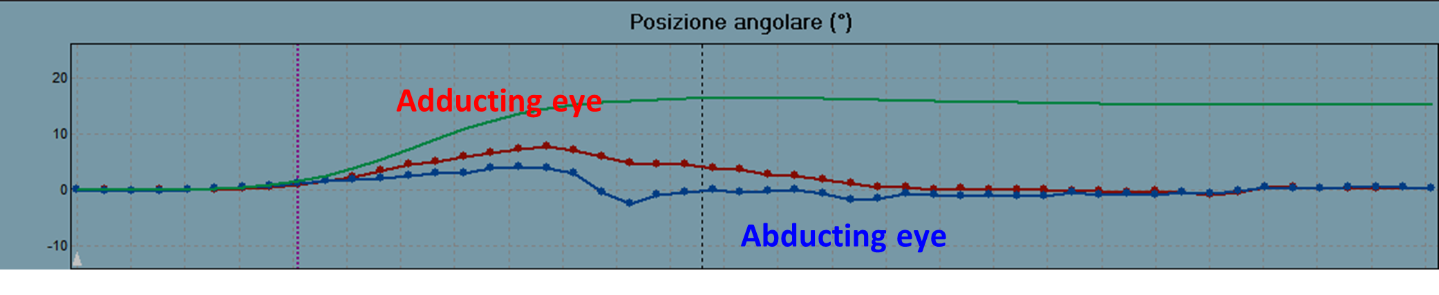 During the movement of the head to the left, the right eye (the abducted eye) misses the target slightly and reaches it with a couple of saccades; the left eye (the adducted eye) consistently misses the target and slowly reaches it with a glissade. The left eye, moving further away from the zero of the gaze position graphs, consequently, expresses a reduced gain.